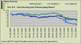 It is evident that while the initial stages of the financial turmoil did indeed push up the JPY against the three big OECD currencies the last six months have seen an absolute surge in the JPY. Especially the move against the GDP is staggering although it must be seen in light of the fact that Sterling has been completely buggered on a wide scale during the past months.