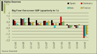 Kenneth Wattret who is a senior economist at BNP Paribas simply noted that the news was dire and dished up the thump of a forecast that we are going to see three consecutive quarters of contraction as well as a huge rise in unemployment. Over at Illuminati, Jim O'Neill noted rather smugly that the downturn is worse in Europe than in the US which, given the fact that the whole thing started in the US, is quite an achievement as he puts it. In terms of economic dynamics the Eurozone is being hit by a severe slump in domestic demand as well as a sharp decline in global and intra EU27 trade volume (yes, my dear reader, the East-European connection is important). Add to this that governments in the Eurozone are pretty much out of bullets at this point as well as the fact that the ECB refuses to fire offs its, albeit timid, remaining slugs and the outlook is grim and nothing but grim.