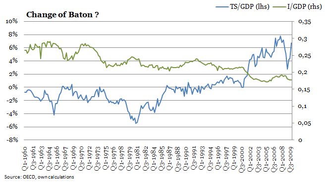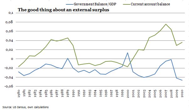 True; Germany is moving into this with an overall lower level of debt/gdp and if there is something the Germans take pride in, it is their ability to impose self-inflicted pain and austerity to correct and to increase competitiveness and achieve growth from external sources. Yet, this brings us right back smack into the wall here since this is exactly where we don't want Germany to go, but exactly because of the demographic prospects, it is where Germany must go. In this way, Germany needs an external surplus for the same reason that Japan needs one; the expected return in the German economy and the underlying future government liabilities would not allow Germany to finance an external deficit at "acceptable" yields. This is curious in light of that that the yield on German bonds are used as benchmarks for the obvious reason that Germany is a net external lender, but what if this changed?