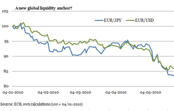 Since the beginning of 2010 the Euro has depreciated 14% and 16.5% agains the USD and JPY respectively and this is remarkable in an environment where risk aversion has unwound. In short; when it comes to the game of cards in terms of global liquidity/capital flows where holding old maid means that you buy bear the brunt of intra-G3 appreciation. This is what I wrote in my sneek-peek into 2010 G3 FX markets;