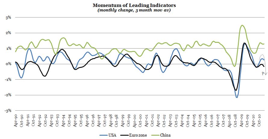 On the basis of the data I am looking at, the upward momentum of global leading indicators peaked a year ago (in Q4-09) and momentum has since steadily declined to reflect growth returning to "normal" after the sharp recovery following the global financial crisis. The most recent soft patch in the middle of 2010 gave way to a rebound, but the key is whether the recent relative decline in growth momentum is a messenger of a more sustained downturn or simply another so-called mid cycle soft patch. OECD's leading indicators point to a definite slowdown but also to a rebound towards the end of the year. The main point really is one of divergence between economies.
