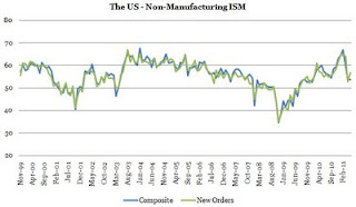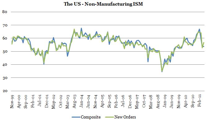 So far, so good then. I would reiterate the point on the ISM indices which have turned decisively down lately with especially the manufacturing ISM shifting down considerably both in terms of the coincident activity index and new orders. The same goes for the non-manufacturing ISM although it eeked out a bright spot in May with an increase in the new orders component.