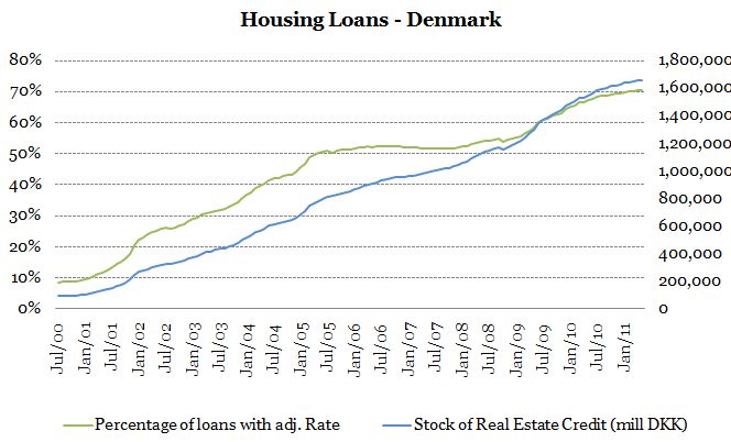 Recently, the EU commission issued a report with a stark warning to Danish policy makers that both the size and structure of the housing market with the majority of loans made up by variable interest rate and no-amortisation/down payment (often both in the same loan!) represented a current and future source of instability. The Danish central bank has even suggested to phase out these loans entirely even if it seems that such a proposal has not got political backing in the Danish parliament regardless of the result of this year's election.