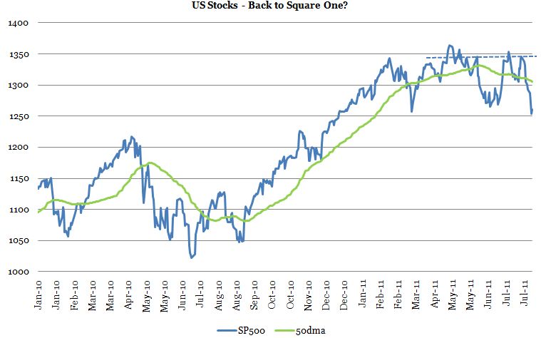 Starting a new job and settling in a new city/flat has proved a little more unsettling for my blogging efforts than I had expected. Anyway, what better time to return to the fray when the SP500 completes its worst run in a long time returning to levels not last seen since March where we thought we had to write off the entire Japanese economy as a nuclear wasteland. So, is it all back to square one for the already weak recovery?