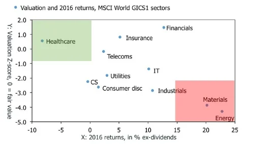 The chart essentially tells four stories. Firstly, it chimes with the point made above that the outperformance of the industrial/energy complex is ripe for a fade. Secondly, it points to healthcare as the most attractive sector for investors to go hunting for “bargains.” Thirdly, it implies that financials remain attractive based on valuations, despite solid performance in 2016. Finally, it suggests that valuations for consumer staples and discretionaries are not attractive, despite poor performance in 2016.