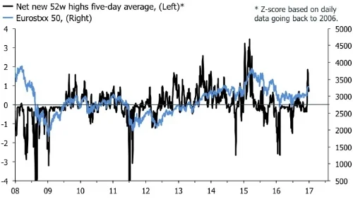 Another primary indicator increasingly showing support for a defensive v cyclical stance is the stock-to-bond ratio. It’s not yet extreme in the U.S., but it has climbed significantly, and supports my inclination towards the idea that the great Trump reflation trade isn’t going to last a whole lot longer. In Germany it also has made a spectacular rebound following the nadir of a trailing 25% in February last year. An investor only armed with this chart would be buying bunds and selling the DAX here.