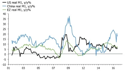 As for "credit impulse" indicators, I have issues with them. The sell-side loves them, but lets be clear about this; credit growth usually is a lagging indicator. If we take its second derivative, though, it often leads coincident indicators. But that's cheating because it means that we're using a second derivative to lead a first derivative. Anyone with basic knowledge of math will understand why this is a problem. Taking the second derivative of a lagging indicator does not make it a leading indicator since, by definition, the second derivative of the coincident indicator will lead the credit impulse. Are you confused? Well, in China's case it might actually work given the tight link between economic activity and credit expansion controlled by a central authority. Seasoned China watchers certainly appear to think so, but I remain sceptical. My experience suggests that real M1—which tracks the most liquid component of money/credit flows—is the best leading indicator in China. It is losing momentum, but not dramatically so.