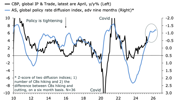 Coincident indicators dipped in April after a March surge driven by tariff front-running. Nevertheless, the underlying trend remained solid and upward at the start of Q2, aligning with the message from leading indicators.