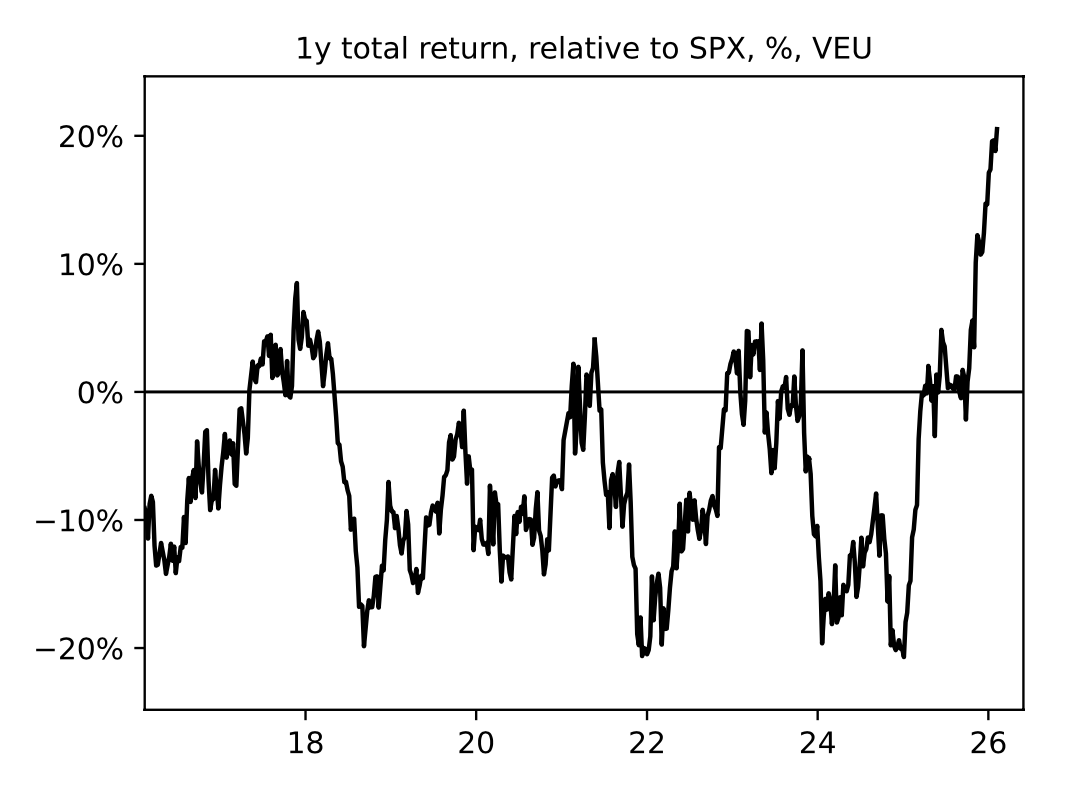 The second chart below shows that equity leadership has shifted markedly since I last updated these charts in October. The real, tangible sectors are now leading the pack, with XLI (Industrials), XLE (Energy), and XLB (Materials) firmly positioned in the top-right quadrant, alongside the powerhouse that remains non-US equities. The relative outperformance of VEU has reached new highs, as the next chart illustrates.
