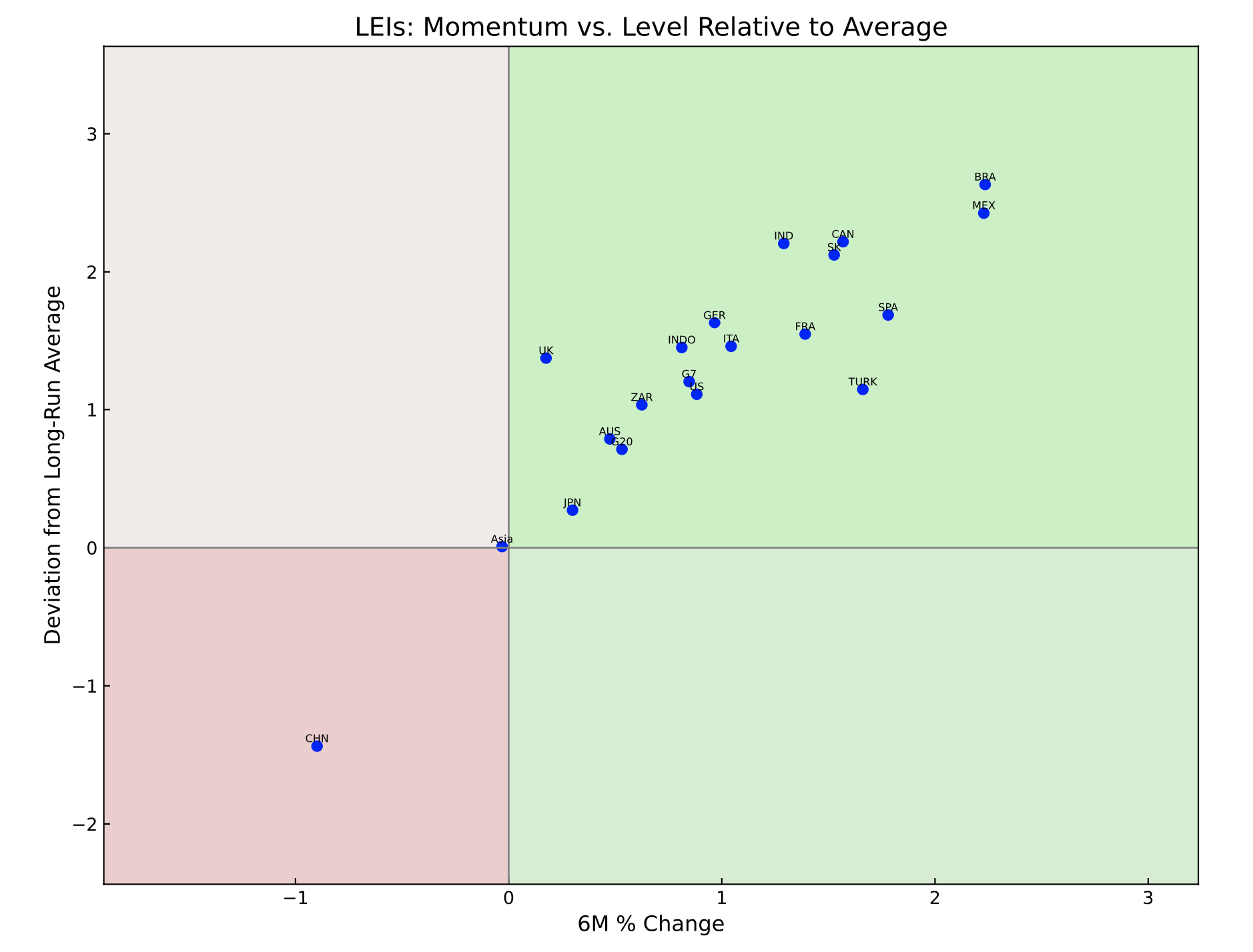 Country-level data point to a broad and robust upturn in global economic activity midway through the first quarter of 2026. China’s LEI remains the only notable weak spot—significant given the size of its economy, which is also weighing on the LEI in Asia.