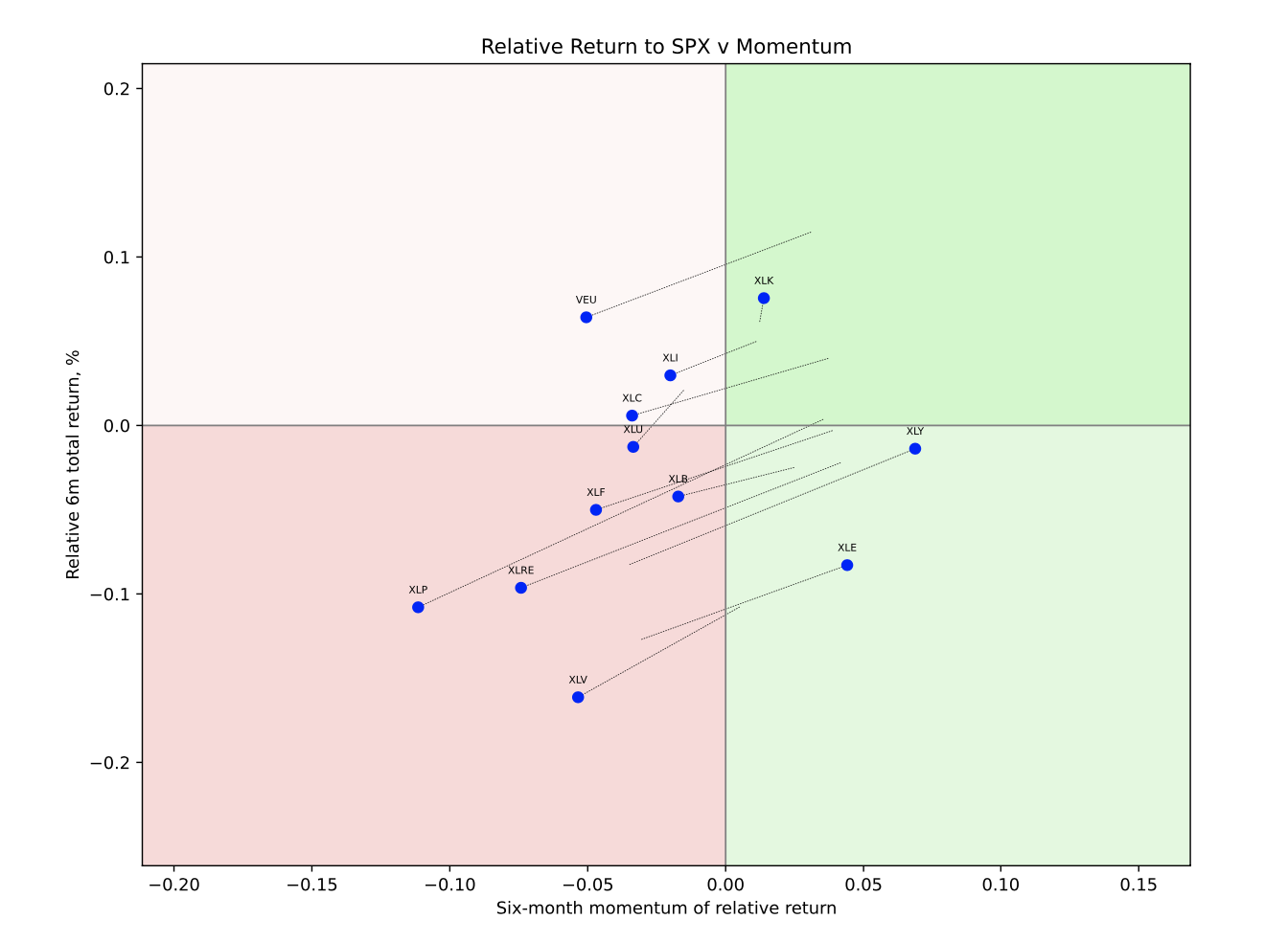 This can serve as a (very) rough-and-ready asset allocation model, informed by two somewhat competing perspectives. In a momentum-based approach, the investor stays overweight in sectors in the top-right quadrant—those with both positive relative returns and momentum—and underweight in the bottom-left quadrant, where both are negative. In a mean-reverting, or anticipatory, model, the assumption is that sectors rotate counter-clockwise over time. In this view, one would be overweight sectors in the bottom-right quadrant, anticipating a move to the top right, and underweight those in the top left, expecting a shift to the bottom left. That said, sectors sometimes rotate from bottom left to bottom right and back again—or between the top two quadrants—without completing a full cycle. This is to say, some time underperformers stay underperforming, and vice versa for outperformers.